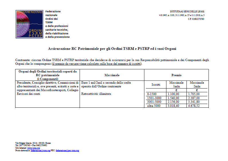 La Federazione Nazionale Ordini TSRM PSTRP ha attivato una Convenzione per consentire agli Ordini territoriali di stipulare una autonoma polizza di Responsabilità Civile Patrimoniale.